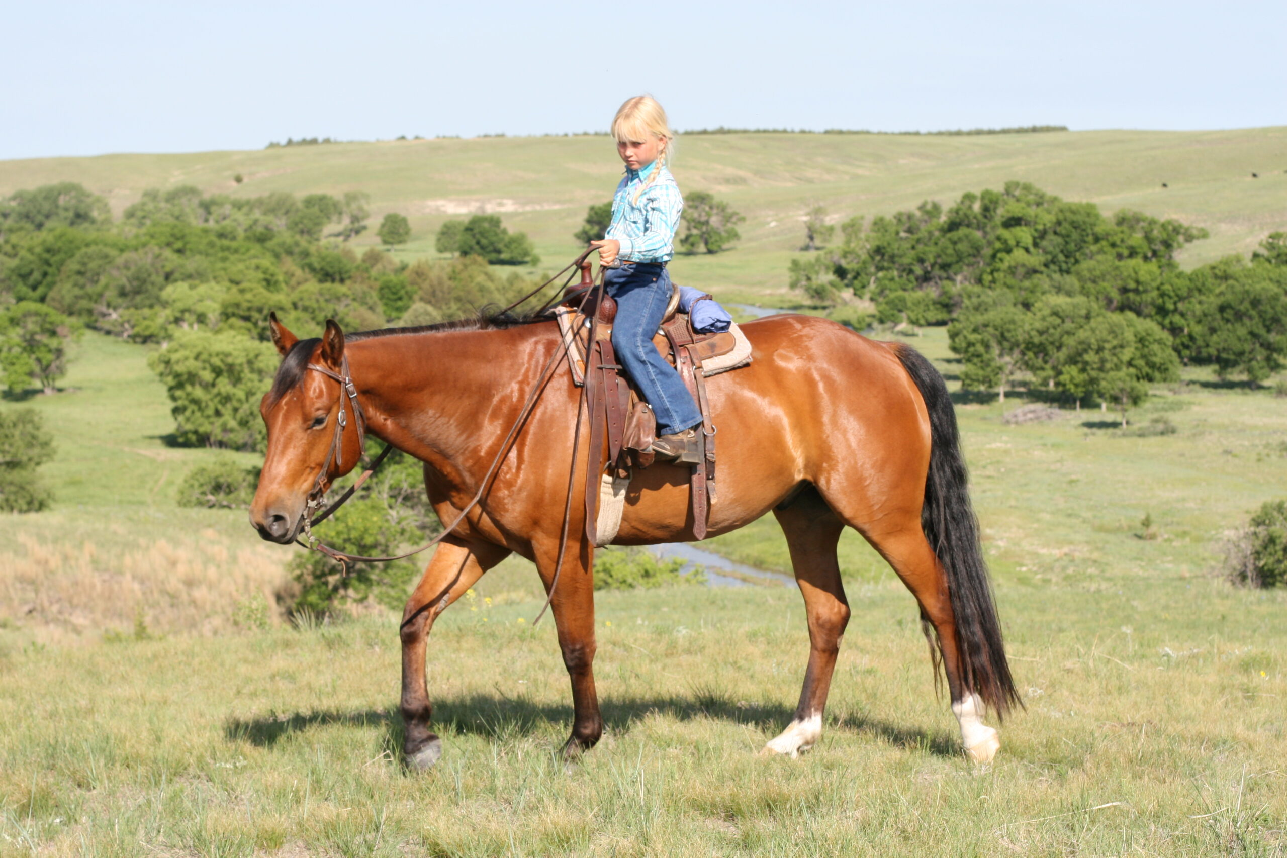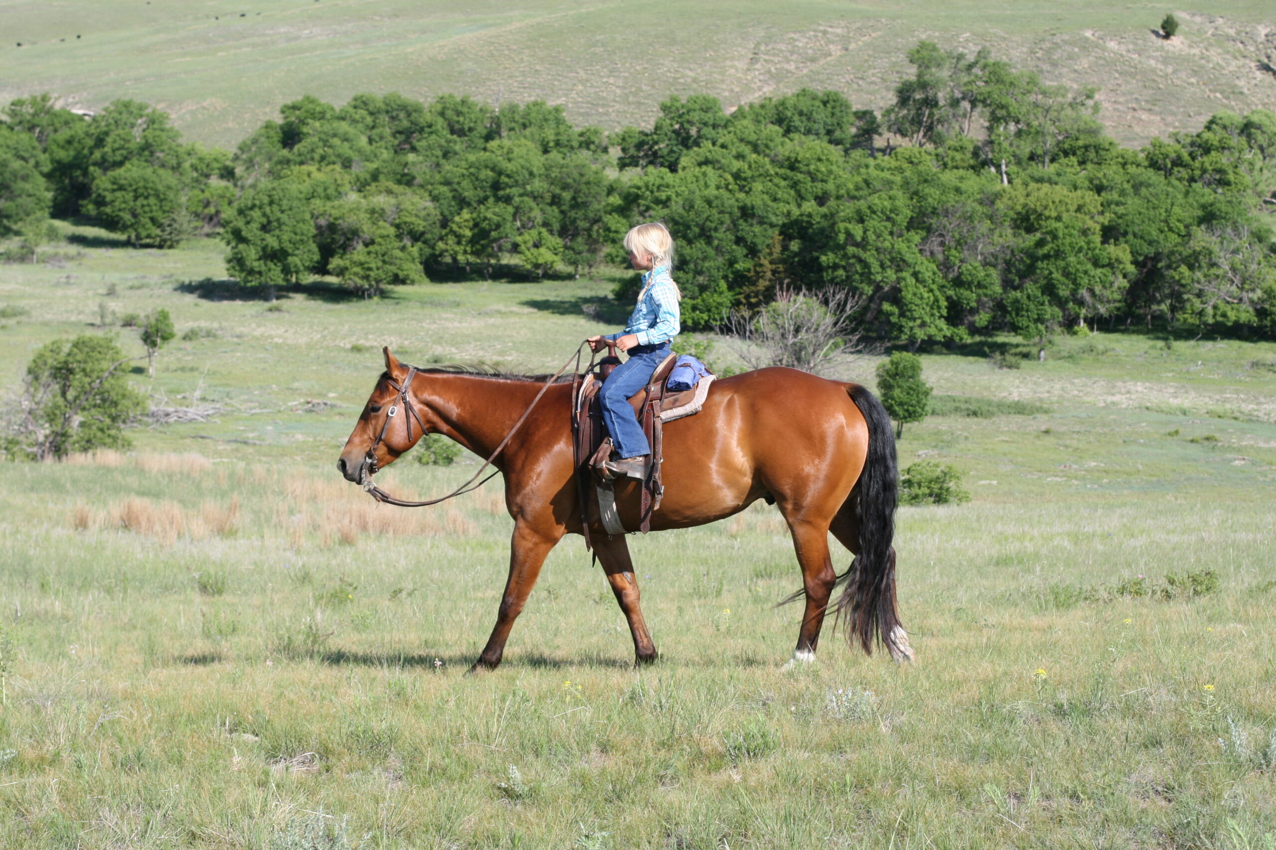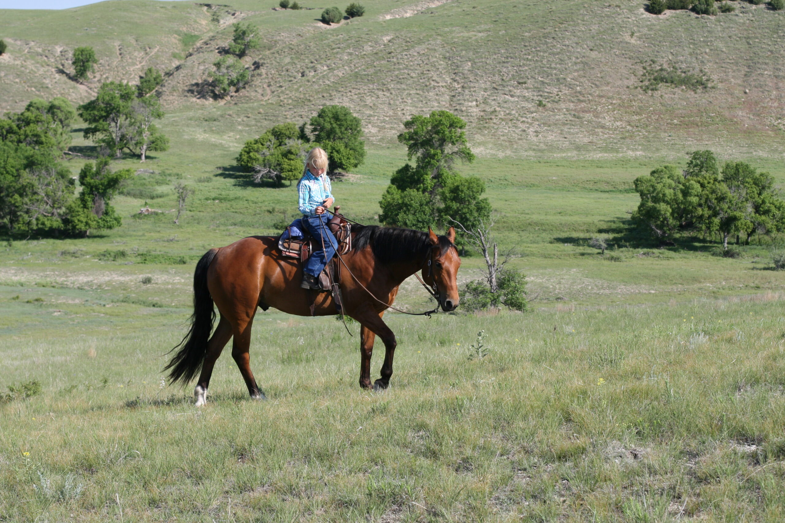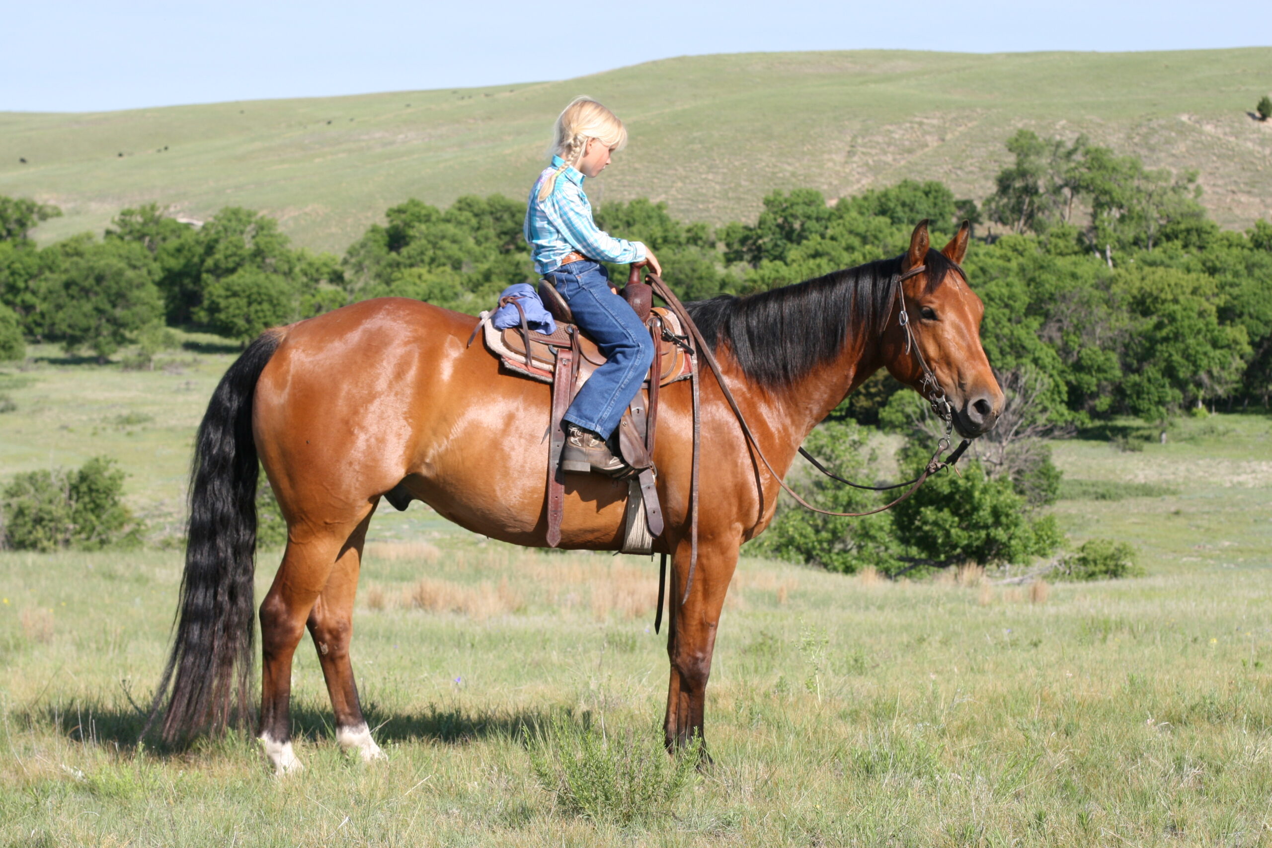 Magic is a very gentle good natured gelding. He has always been easy & became Alice's main big horse when she was still 6 yrs old because Pete had gotten a cut on the front of his leg that needed to heal. Magic soon became Alice's favorite horse to ride out of all the horses because he is short enough for her to get on by herself on a side-hill.. She says he isn't too lazy & keeps a good neck rein for her. Magic stays broke even with months off, has never put a hump in his back. Alice rides him almost every day that we ride & I never warm him up for her, just put her saddle on and off she goes. He is quite cowy and is a lot of fun to work cattle in the pens on. He rides in either a halter, a hackamore or a bit.