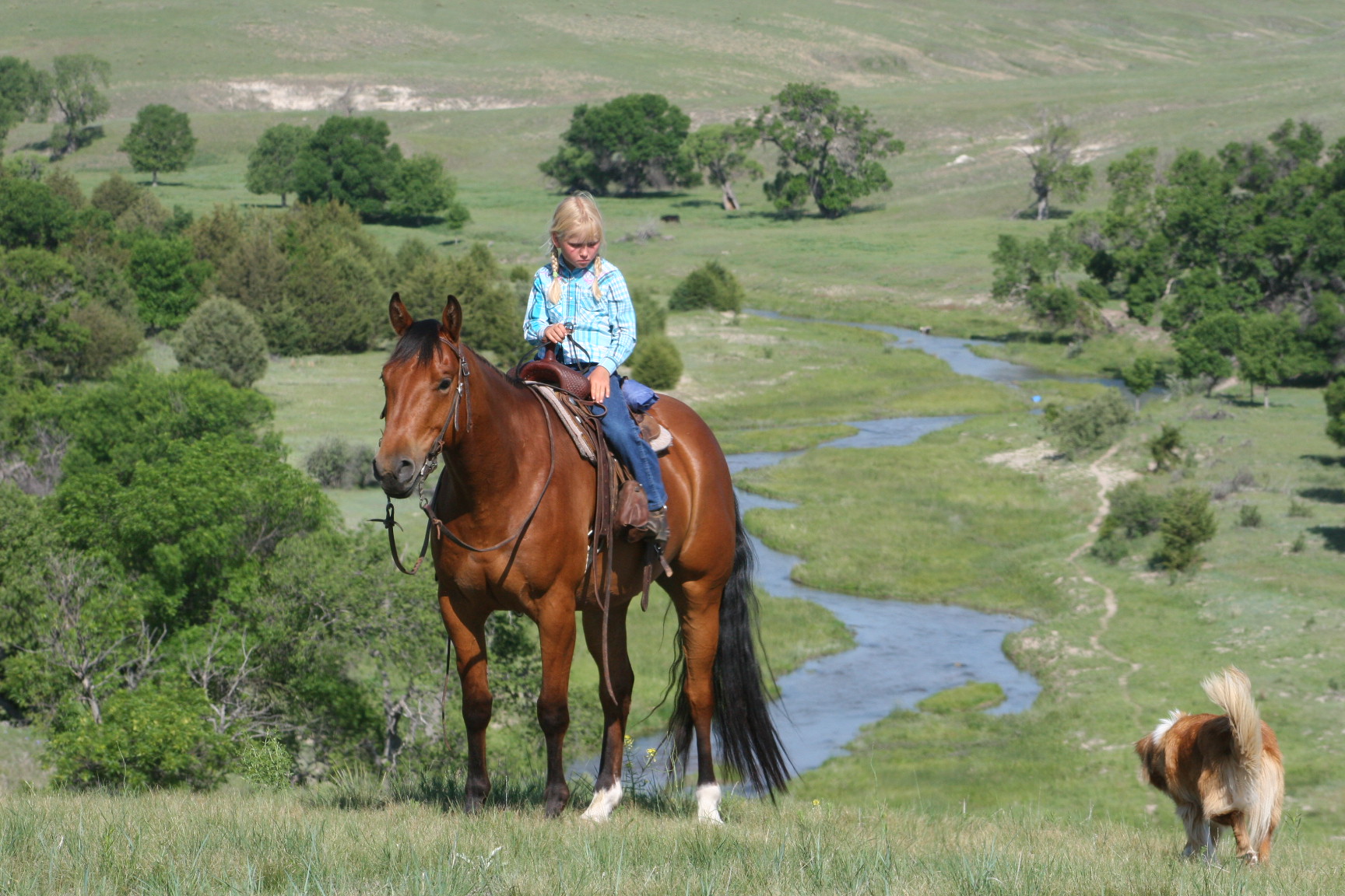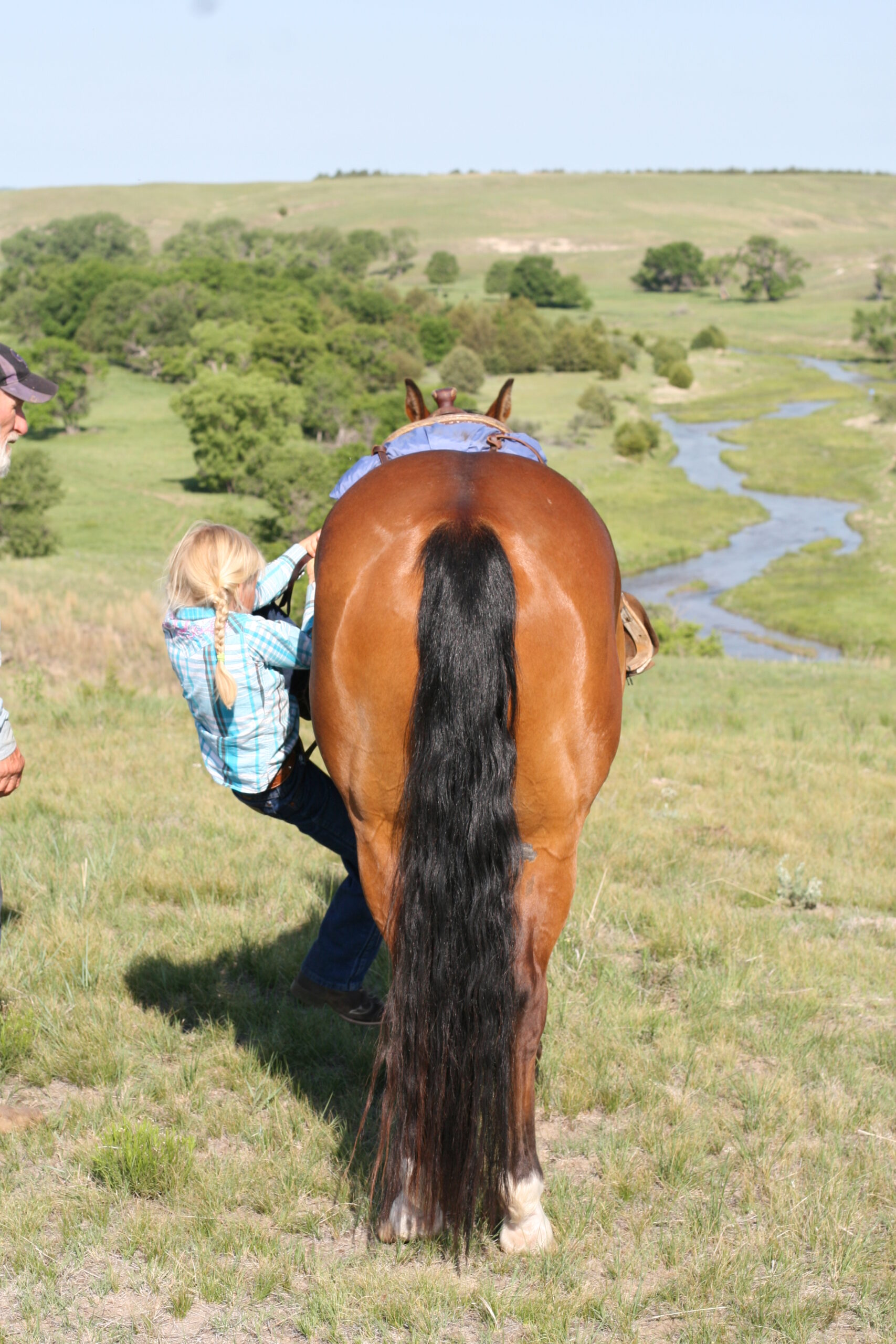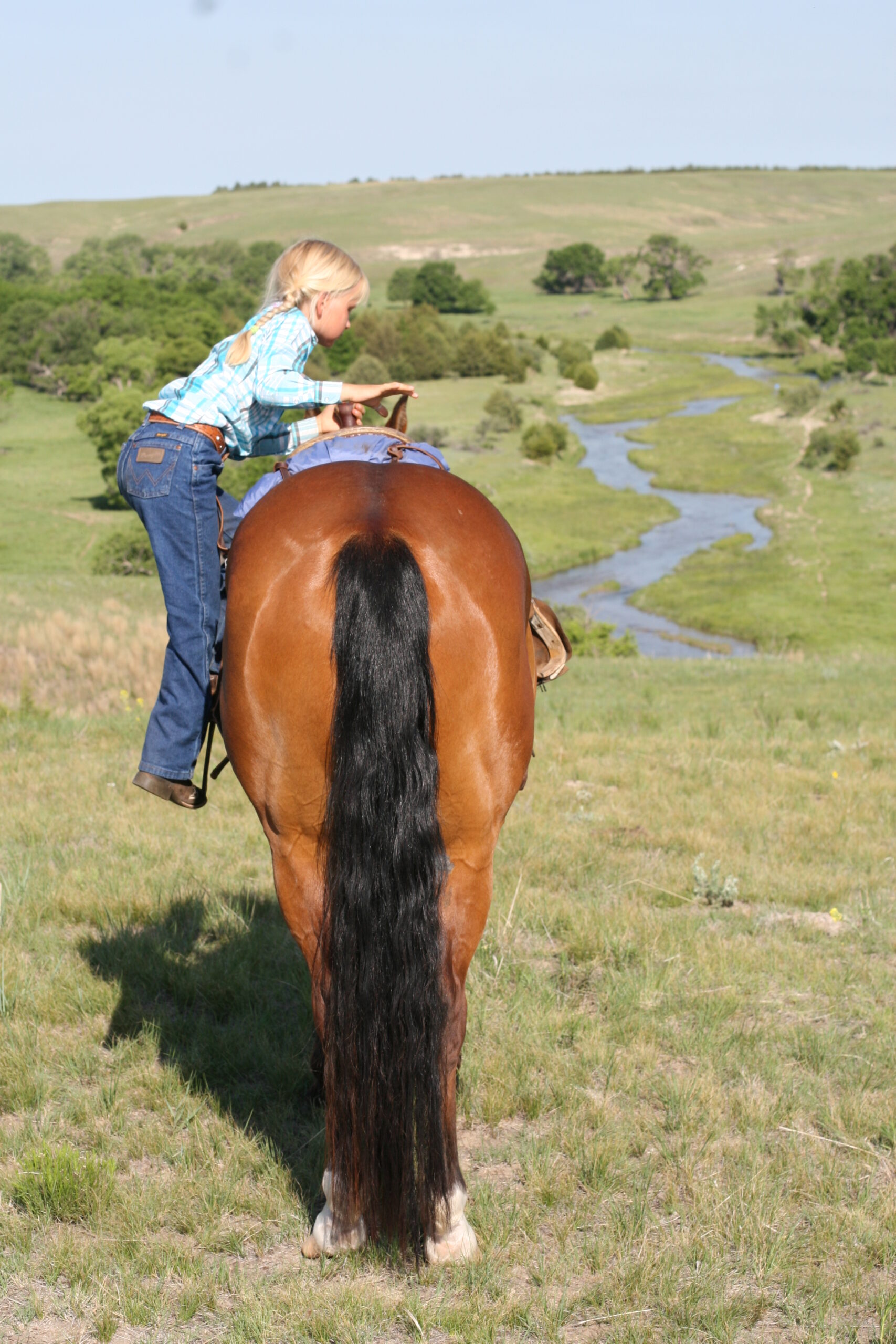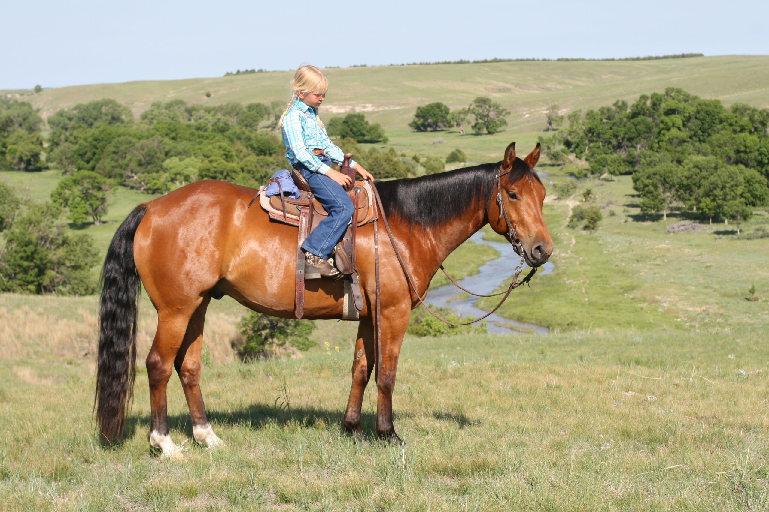 Magic is a very gentle good natured gelding. He has always been easy & became Alice's main big horse when she was still 6 yrs old because Pete had gotten a cut on the front of his leg that needed to heal. Magic soon became Alice's favorite horse to ride out of all the horses because he is short enough for her to get on by herself on a side-hill.. She says he isn't too lazy & keeps a good neck rein for her. Magic stays broke even with months off, has never put a hump in his back. Alice rides him almost every day that we ride & I never warm him up for her, just put her saddle on and off she goes. He is quite cowy and is a lot of fun to work cattle in the pens on. He rides in either a halter, a hackamore or a bit.