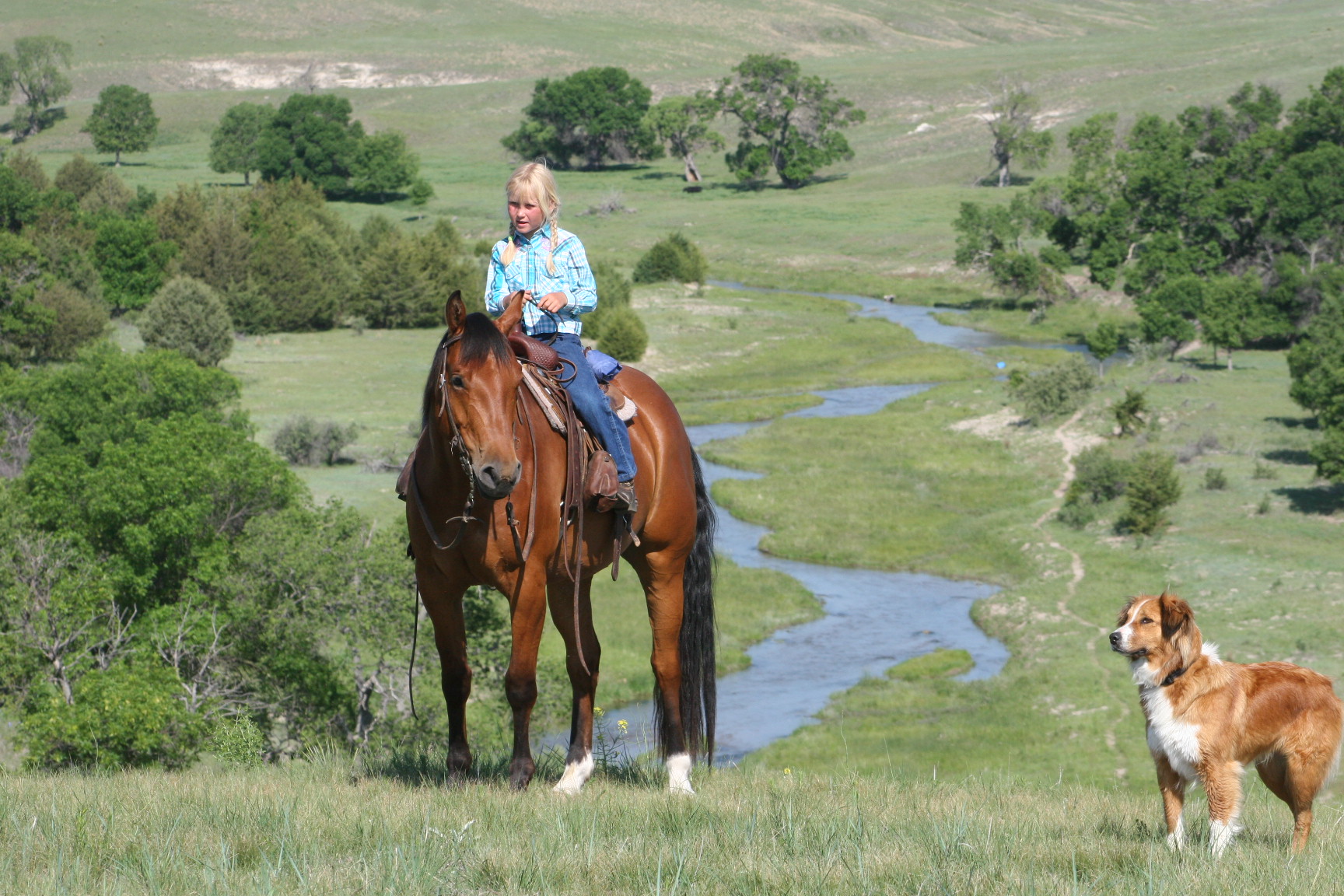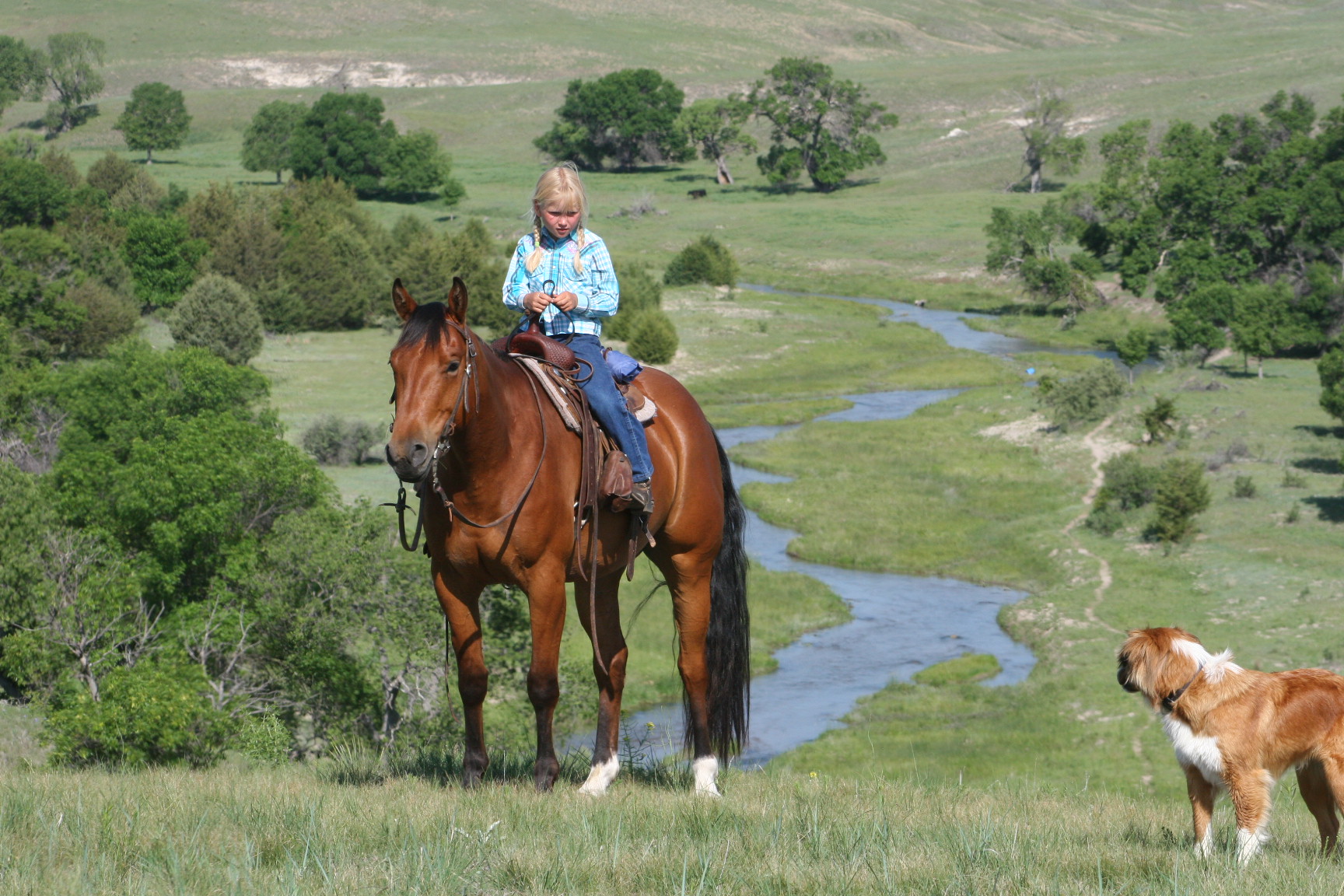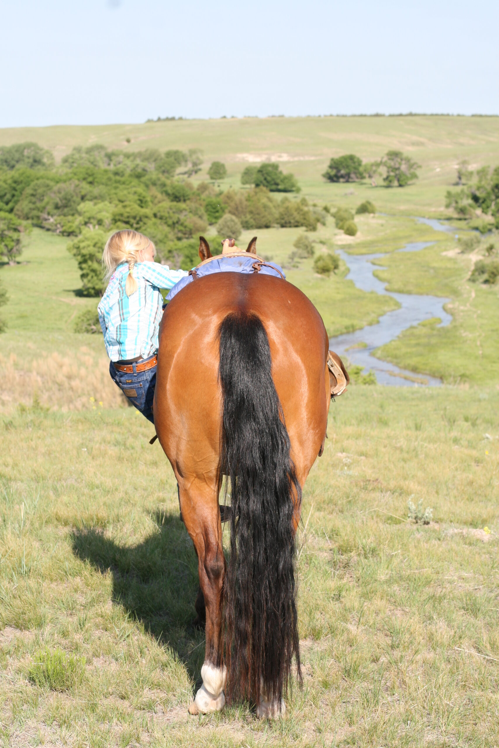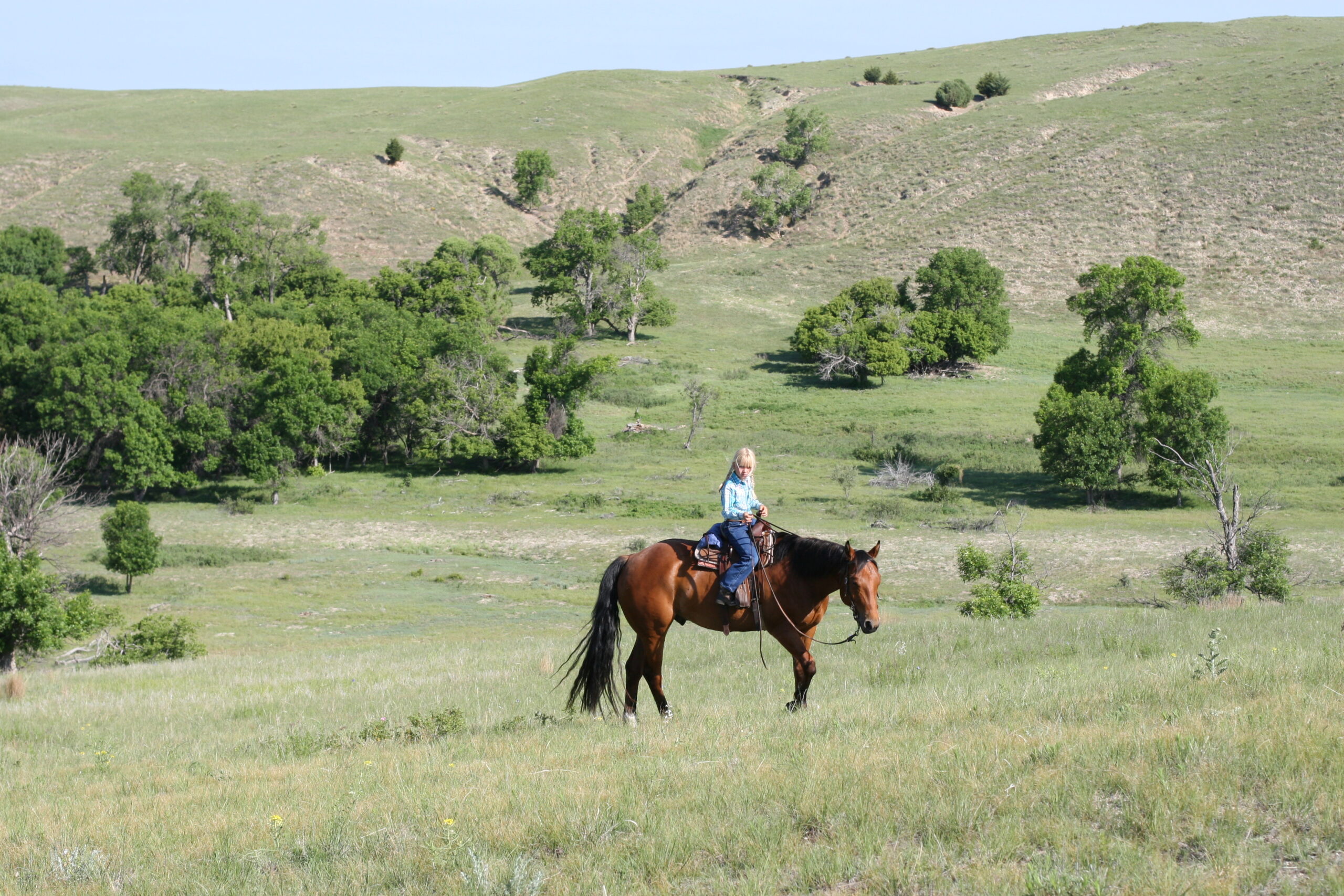 Magic is a very gentle good natured gelding. He has always been easy & became Alice's main big horse when she was still 6 yrs old because Pete had gotten a cut on the front of his leg that needed to heal. Magic soon became Alice's favorite horse to ride out of all the horses because he is short enough for her to get on by herself on a side-hill.. She says he isn't too lazy & keeps a good neck rein for her. Magic stays broke even with months off, has never put a hump in his back. Alice rides him almost every day that we ride & I never warm him up for her, just put her saddle on and off she goes. He is quite cowy and is a lot of fun to work cattle in the pens on. He rides in either a halter, a hackamore or a bit.