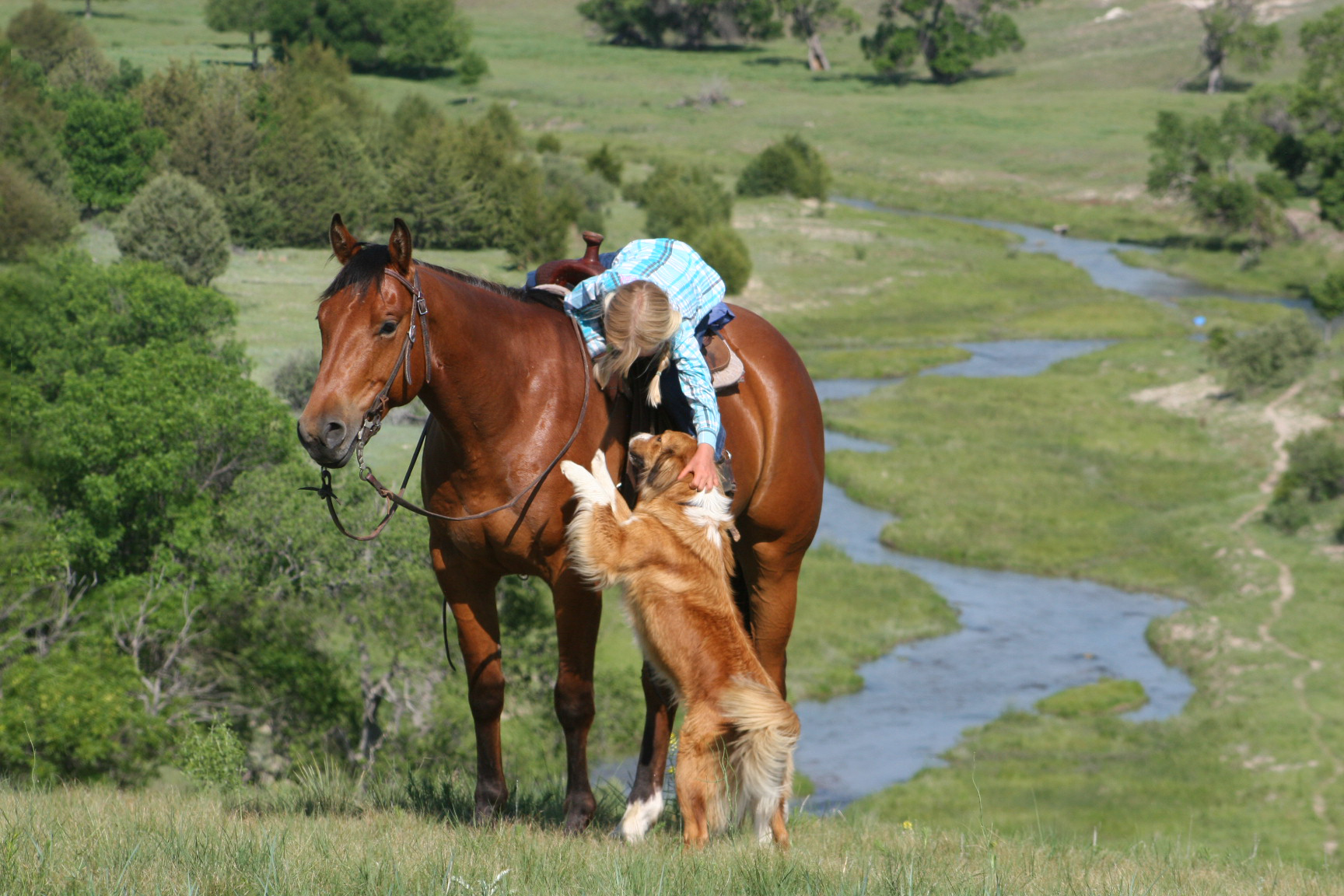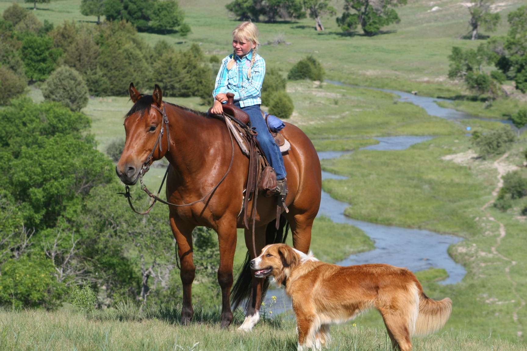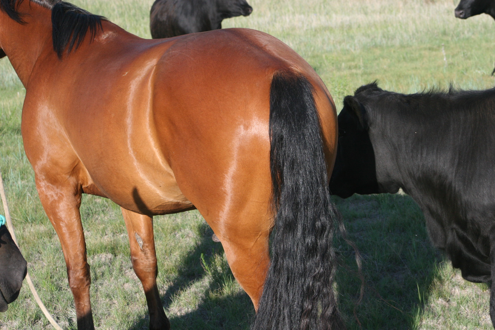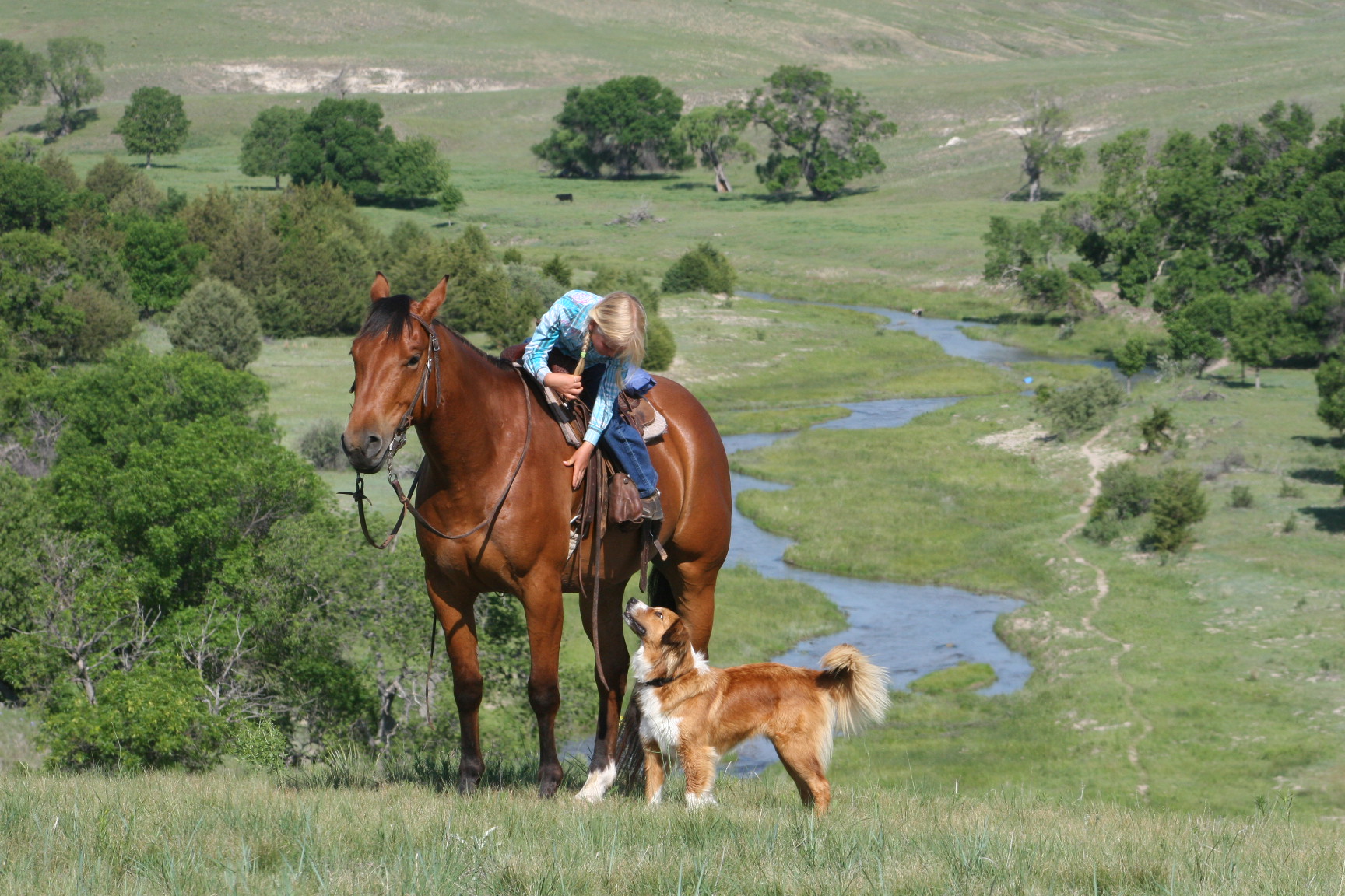 Magic is a very gentle good natured gelding. He has always been easy & became Alice's main big horse when she was still 6 yrs old because Pete had gotten a cut on the front of his leg that needed to heal. Magic soon became Alice's favorite horse to ride out of all the horses because he is short enough for her to get on by herself on a side-hill.. She says he isn't too lazy & keeps a good neck rein for her. Magic stays broke even with months off, has never put a hump in his back. Alice rides him almost every day that we ride & I never warm him up for her, just put her saddle on and off she goes. He is quite cowy and is a lot of fun to work cattle in the pens on. He rides in either a halter, a hackamore or a bit.
