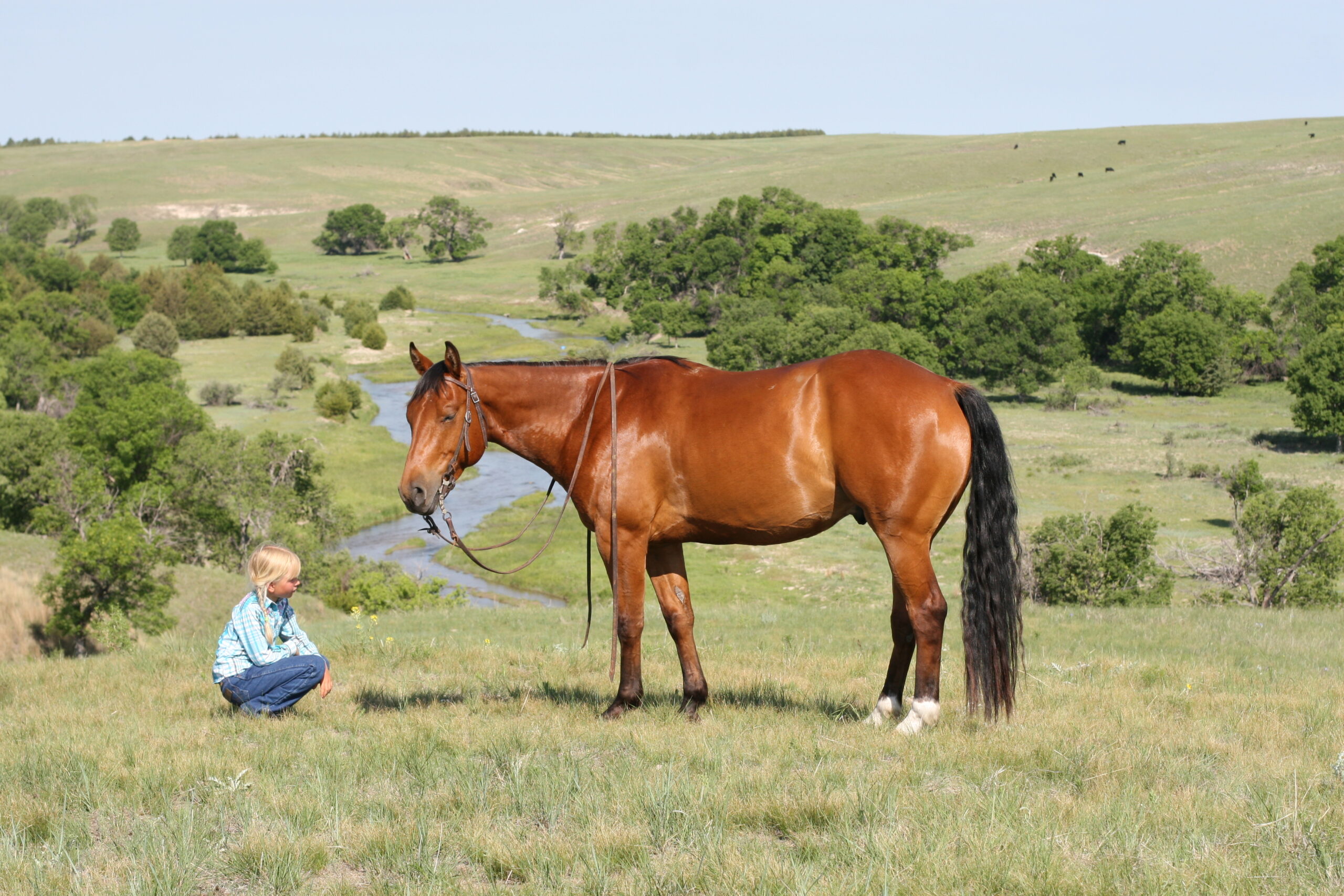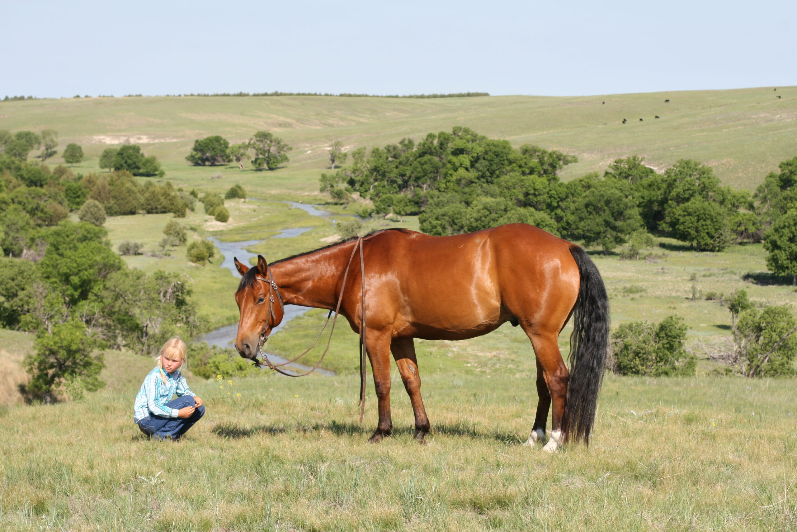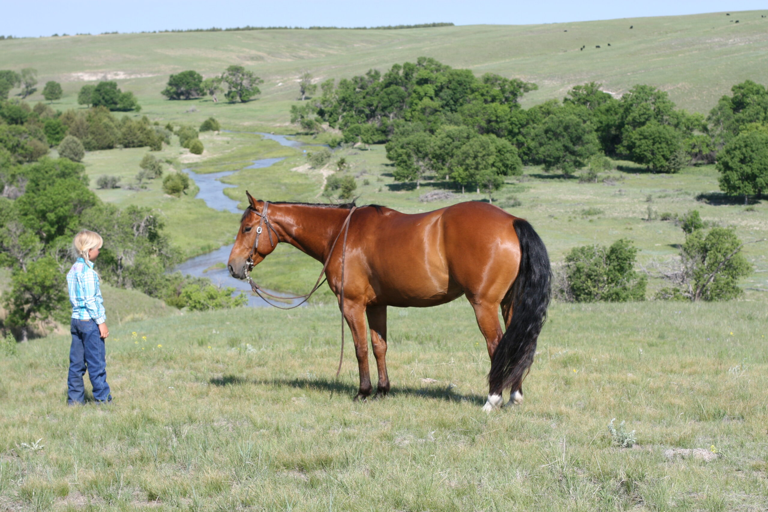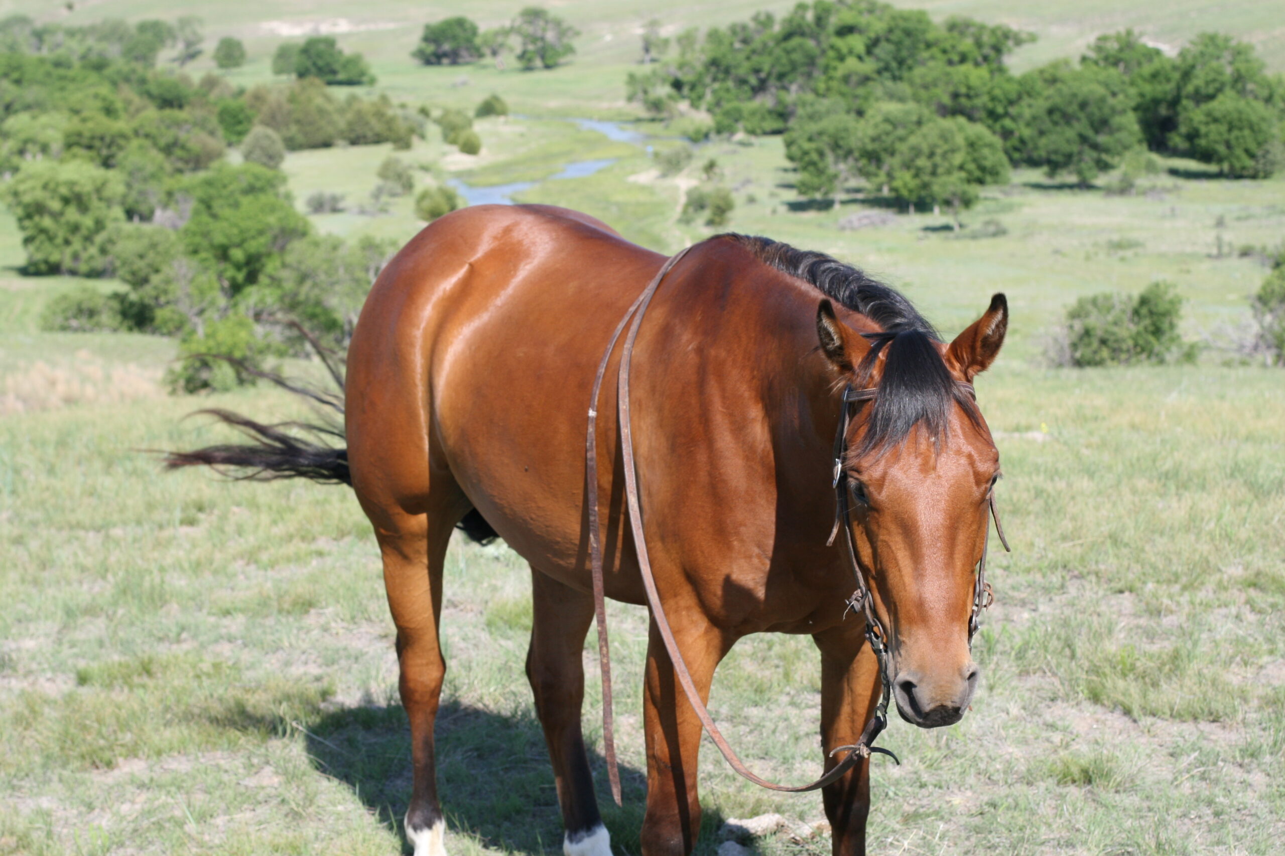 We bought Magic as a 2 1/2 year old, he showed a lot of promise at that age & he has developed just as we had hoped . Anne rode him the fall we purchased him, & Curt rode him the spring of his 3 yr. old year. We also used him during AI work up until 1rst July, Curt rode him again through fall round-up. He is cowy, soft in the face. & always gentle after time off. He is a top ranch & all around family horse, & has the athletic ability to go to the arena. He is super gentle, has a lot of ambition and try.