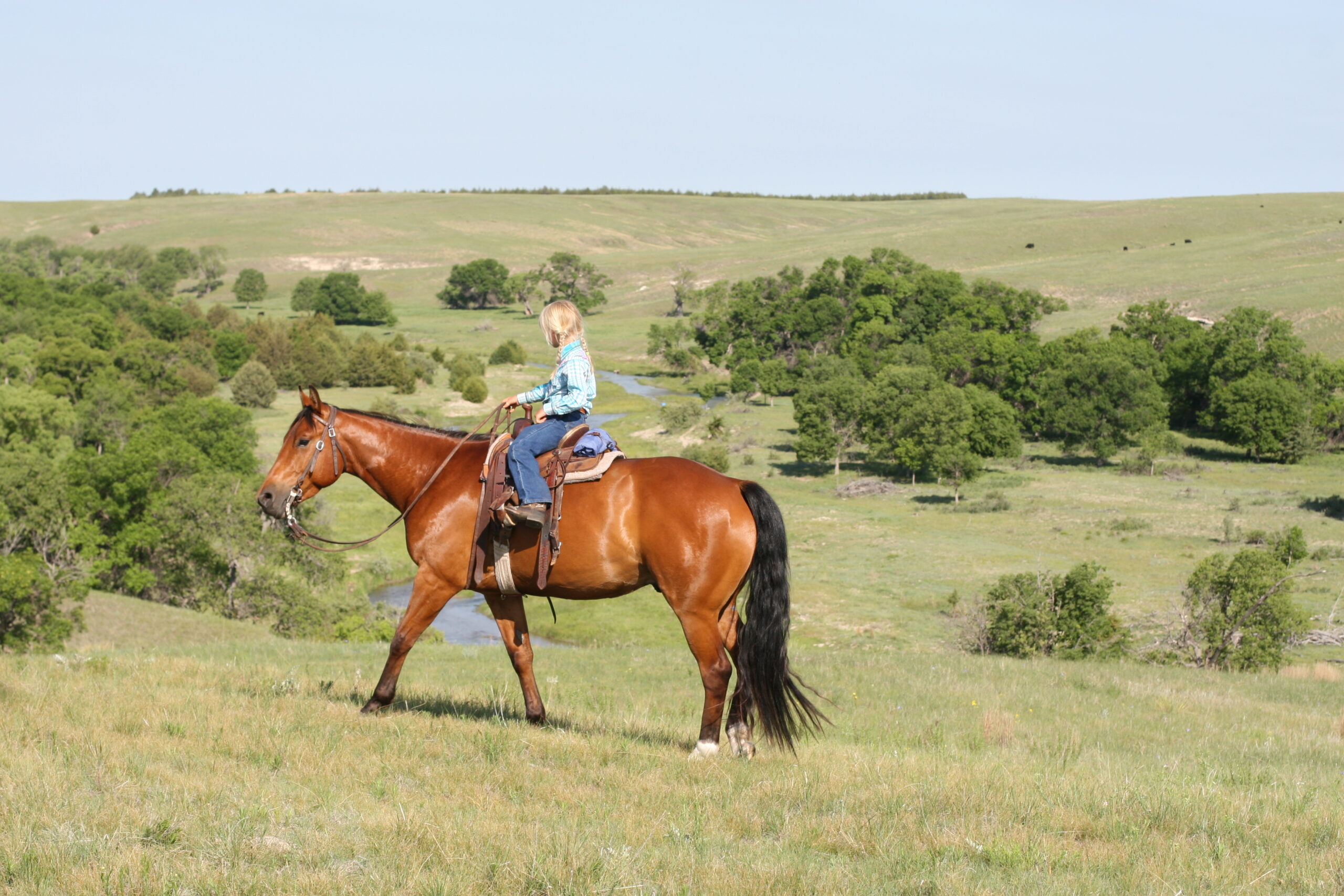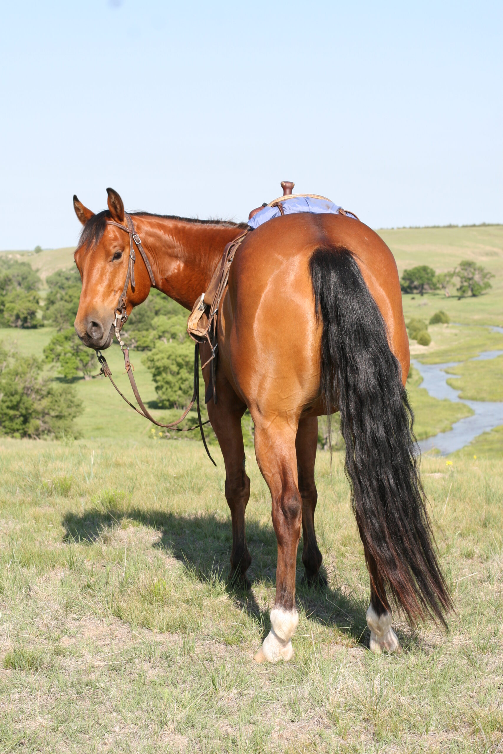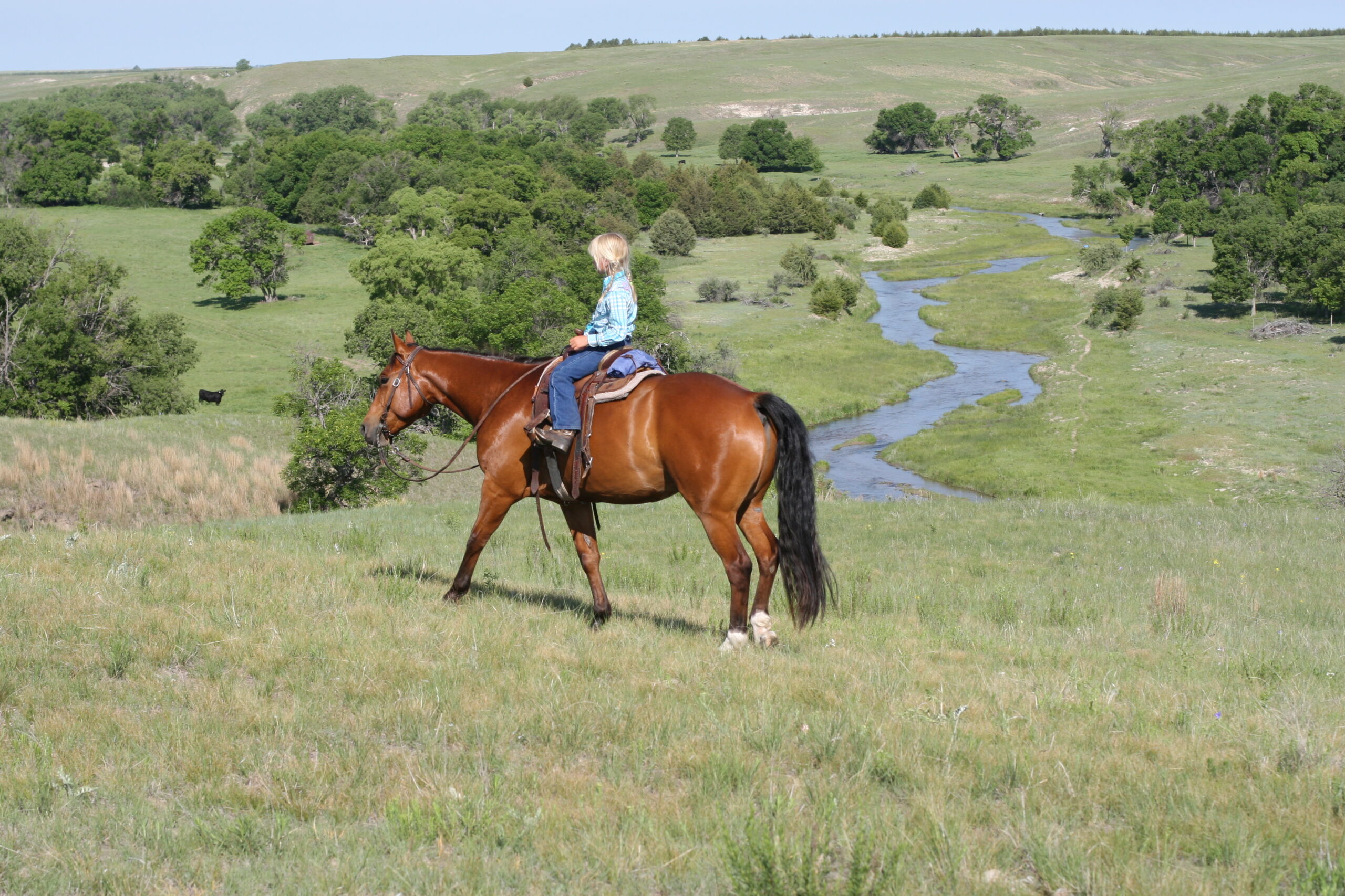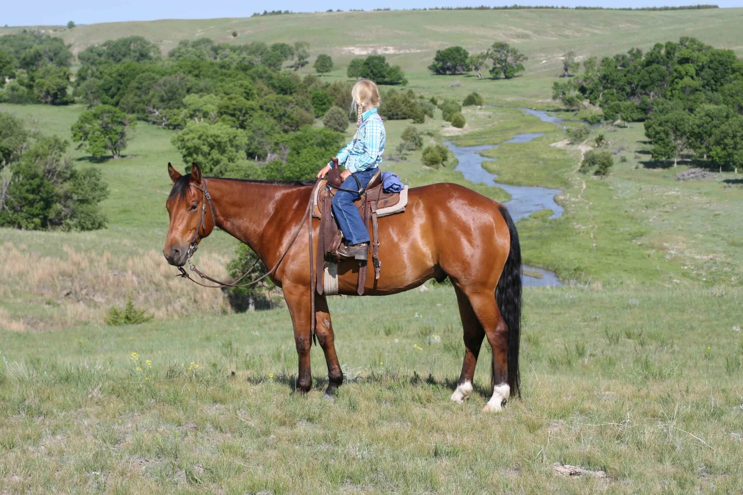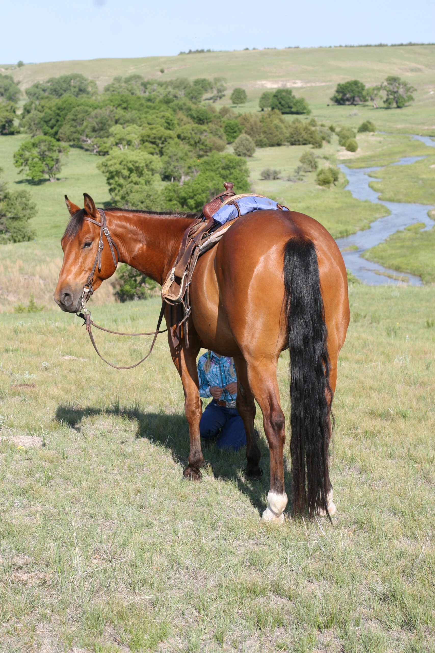 We bought Magic as a 2 1/2 year old, he showed a lot of promise at that age & he has developed just as we had hoped . Anne rode him the fall we purchased him, & Curt rode him the spring of his 3 yr. old year. We also used him during AI work up until 1rst July, Curt rode him again through fall round-up. He is cowy, soft in the face. & always gentle after time off. He is a top ranch & all around family horse, & has the athletic ability to go to the arena. He is super gentle, has a lot of ambition and try.