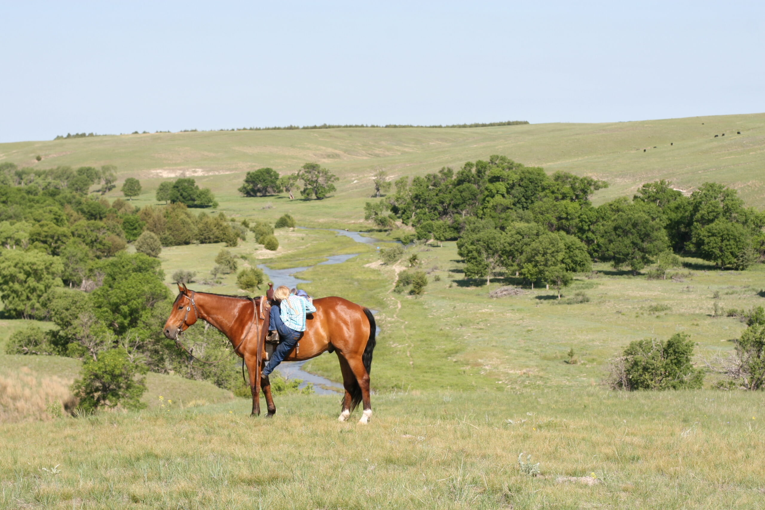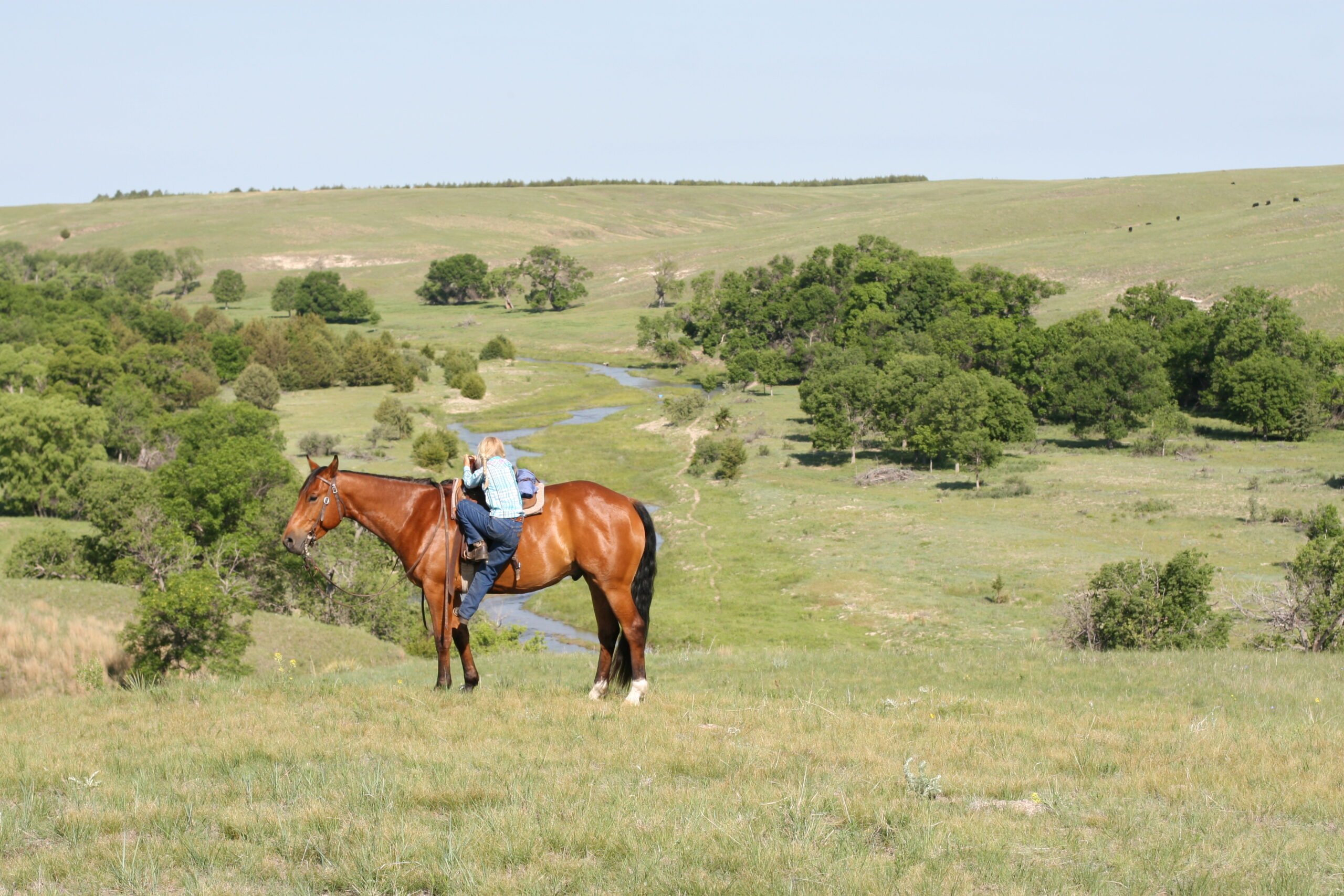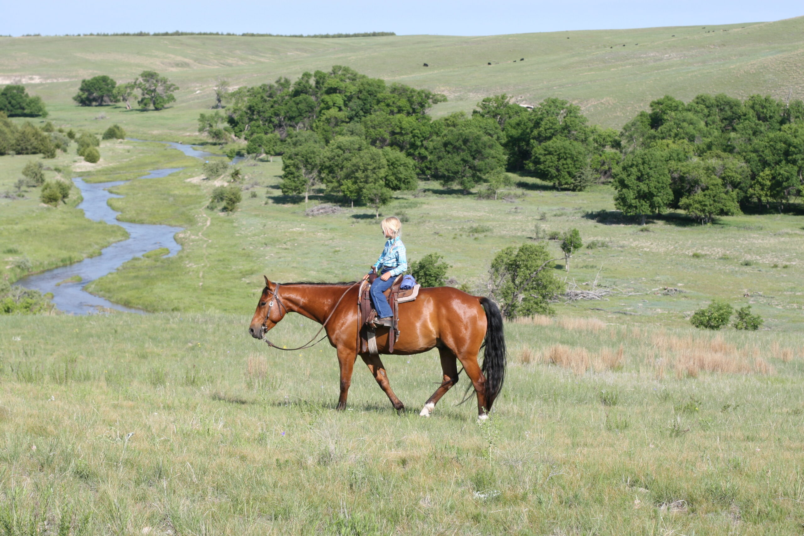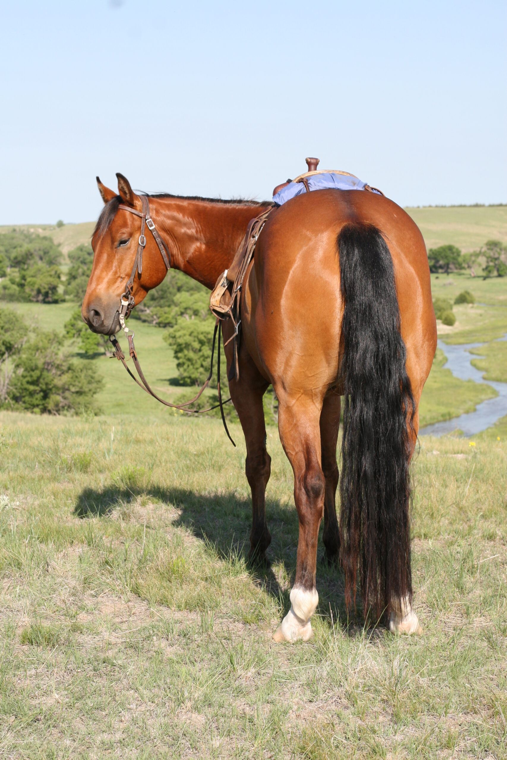 We bought Magic as a 2 1/2 year old, he showed a lot of promise at that age & he has developed just as we had hoped . Anne rode him the fall we purchased him, & Curt rode him the spring of his 3 yr. old year. We also used him during AI work up until 1rst July, Curt rode him again through fall round-up. He is cowy, soft in the face. & always gentle after time off. He is a top ranch & all around family horse, & has the athletic ability to go to the arena. He is super gentle, has a lot of ambition and try.